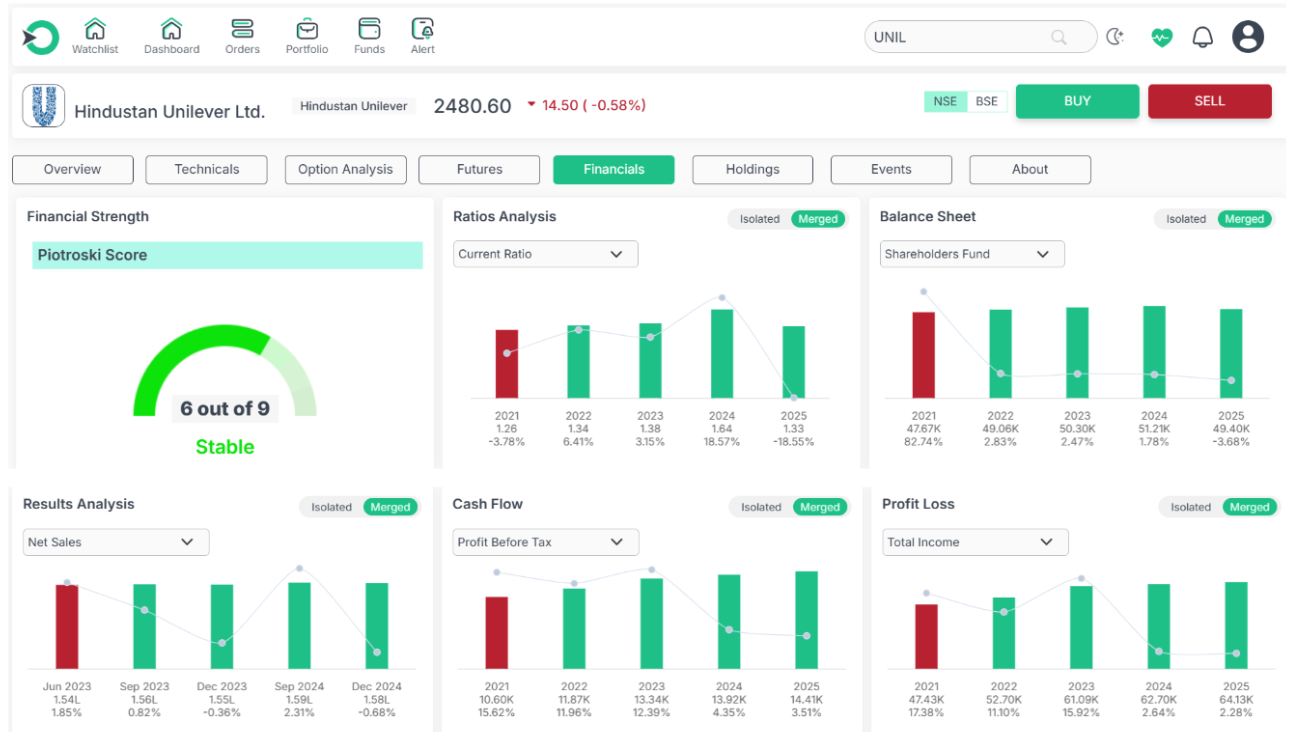 Hindustan Unilever's stock is trading at Rs. 2,554.00, well within its 52-week range of Rs. 2,136.00 to Rs. 3,035.00, reflecting relative price stability. Despite broader market volatility and cost pressures, HUL has maintained a relatively stable price band. This indicates investor confidence in its long-term prospects and earnings visibility. The company trades at a P/E ratio of around 60x, justified by its diversified portfolio, leadership across segments, and consistent profit growth.