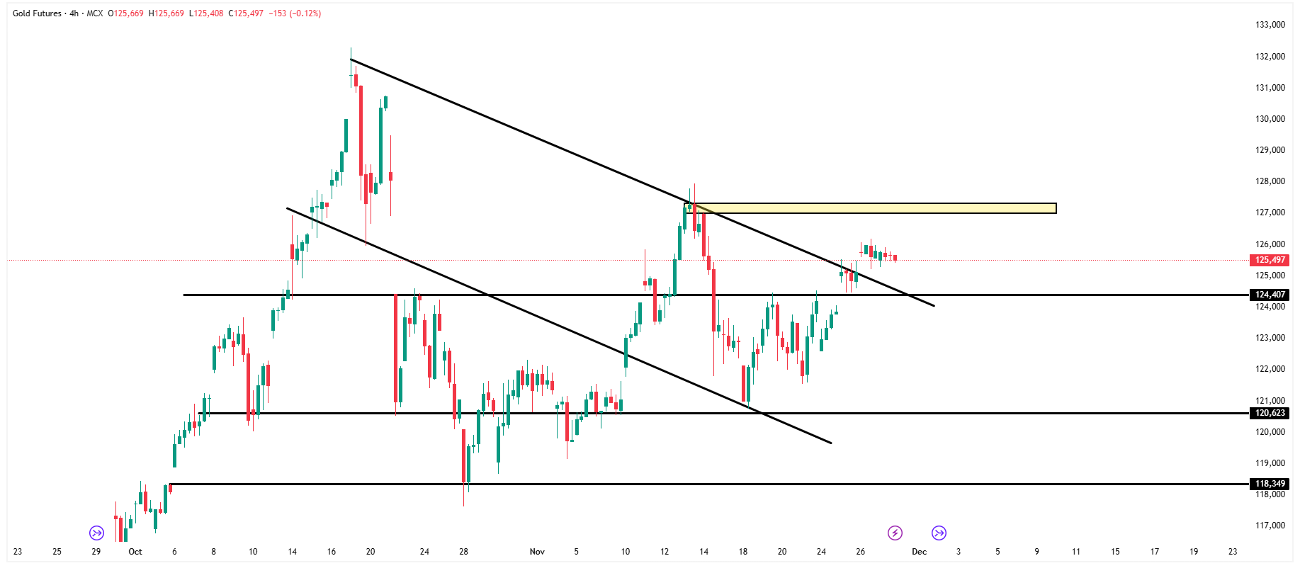 Gold futures are trading near 125,500, currently consolidating just below the falling channel resistance. The broader structure shows a corrective downtrend, but price has reclaimed the key horizontal support at 124,407, turning it into a short-term base.