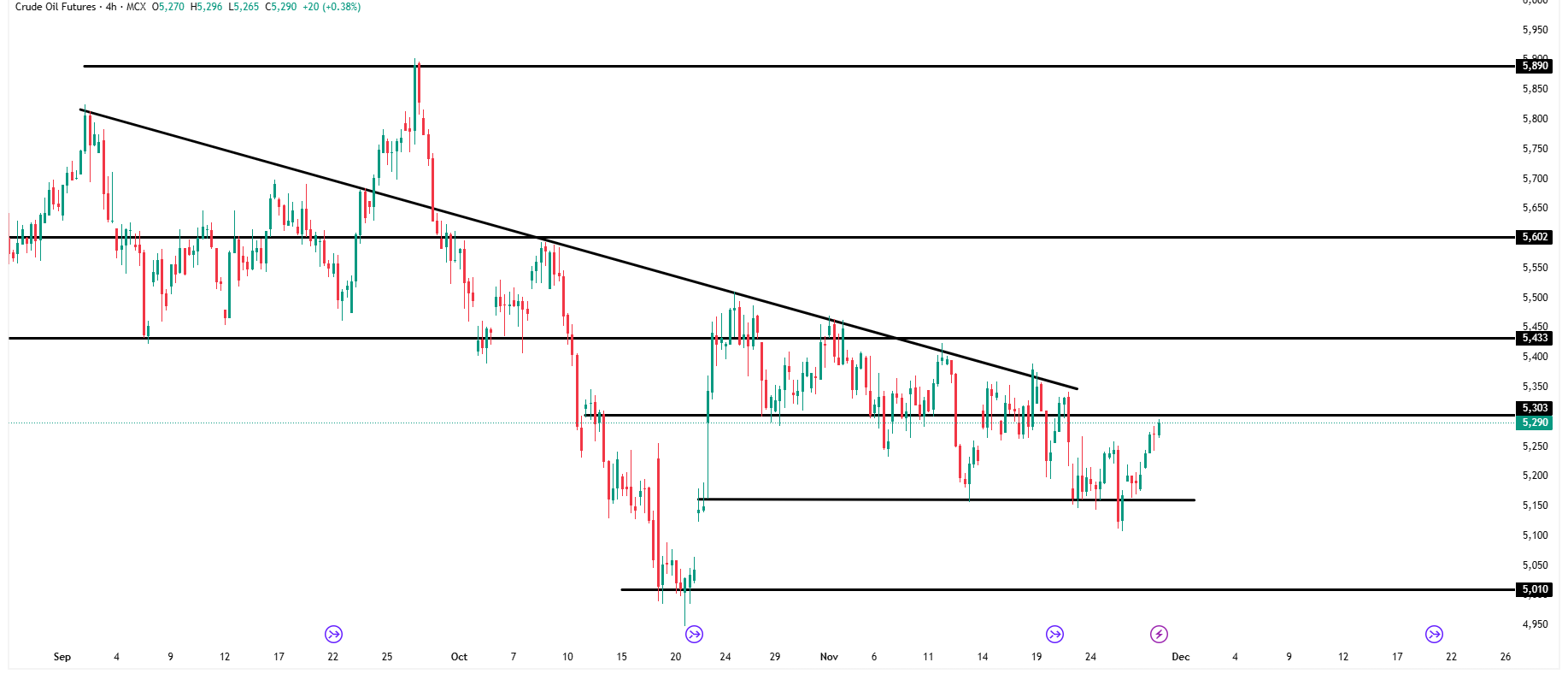 Crude Oil futures are trading near 5,290, showing early signs of bullish recovery after defending the support zone around 5,155. Price is currently testing the 5,303 horizontal resistance as well as the major descending trendline that has controlled the downtrend since October. A decisive breakout above both of these levels would confirm a short-term trend reversal.