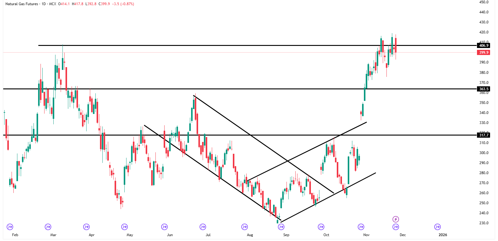 Natural Gas futures are currently trading around 399.9, showing a pullback after failing to sustain above the major resistance zone at 406.9. Price is now consolidating near this supply area after an aggressive breakout rally from 317.7 and 363.5.