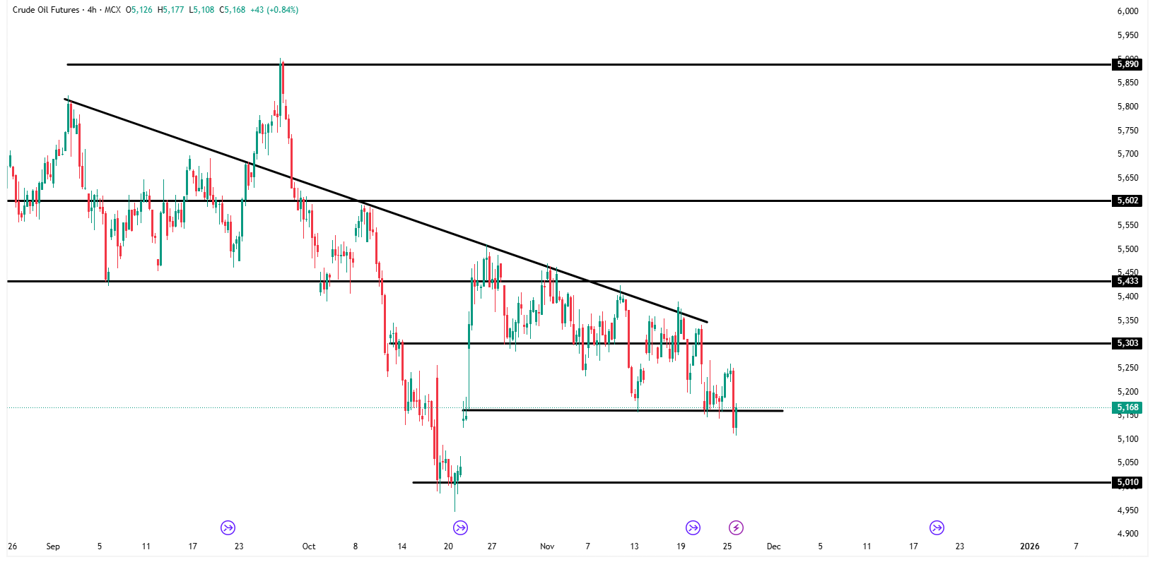 Crude Oil futures are currently trading around 5,168, attempting to hold above the immediate support zone near 5,150. Price remains in a broader downtrend, consistently respecting the descending trendline stretching from the recent swing highs.
