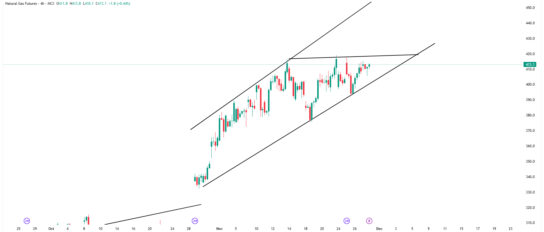 Natural Gas futures are trading near 413, moving inside a clear rising channel and now approaching the upper trendline resistance. Price action shows repeated rejections from this upper boundary, indicating seller presence at higher levels.
