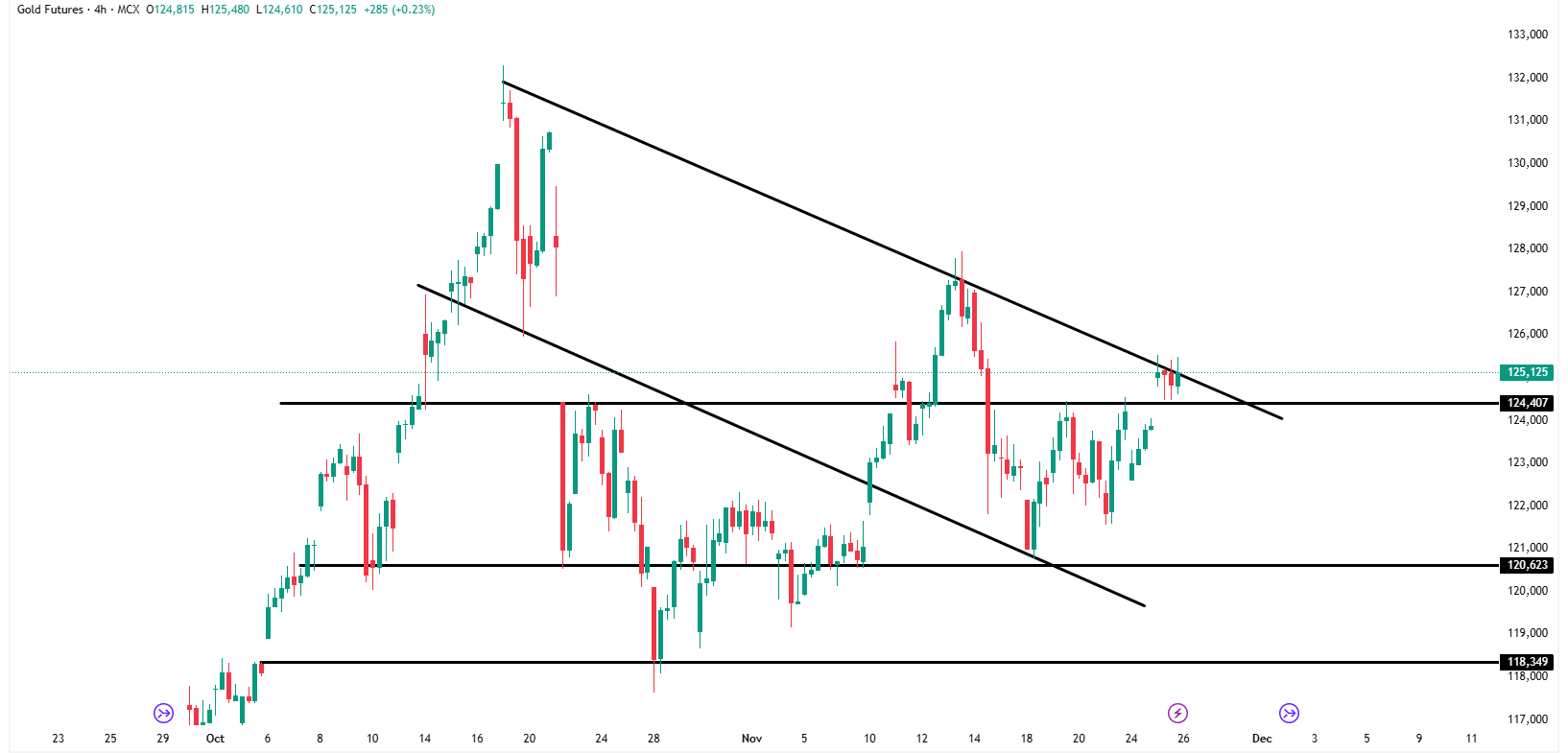 Gold futures are currently trading near 125,125, attempting to break above the descending trendline resistance. Price is consolidating just above the key horizontal level at 124,407, which has now turned into an important pivot zone.